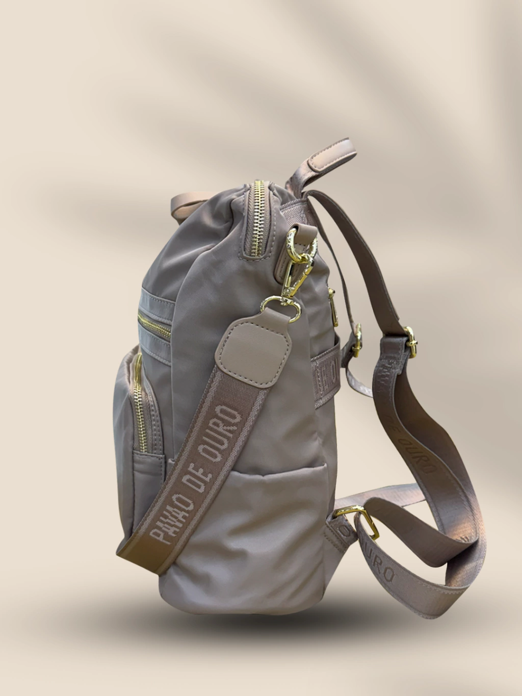 com detalhes em metais inoxidáveis e nylon impermeável.