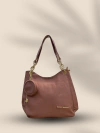 Bolsa modelo saco com detalhes em correntaria nas alças, dourado no metal inoxidável e couro ecológico tamanho médio.